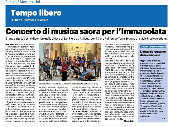 Lunedì 8 dicembre, alle ore 21, la suggestiva cornice della chiesa di San Piero ha accolto un folto pubblico per una serata dedicata al canto e alla musica. Protagonisti dell’evento il Coro Polifonico Terra Betinga, storica realtà musicale aglianese, che ha ospitato la giovane orchestra barocca della MAiC Music Academy, dando vita a un incontro artistico di grande valore. La data, coincidente con la festa dell’Immacolata Concezione, ha conferito al concerto un significato ancora più profondo e simbolico.